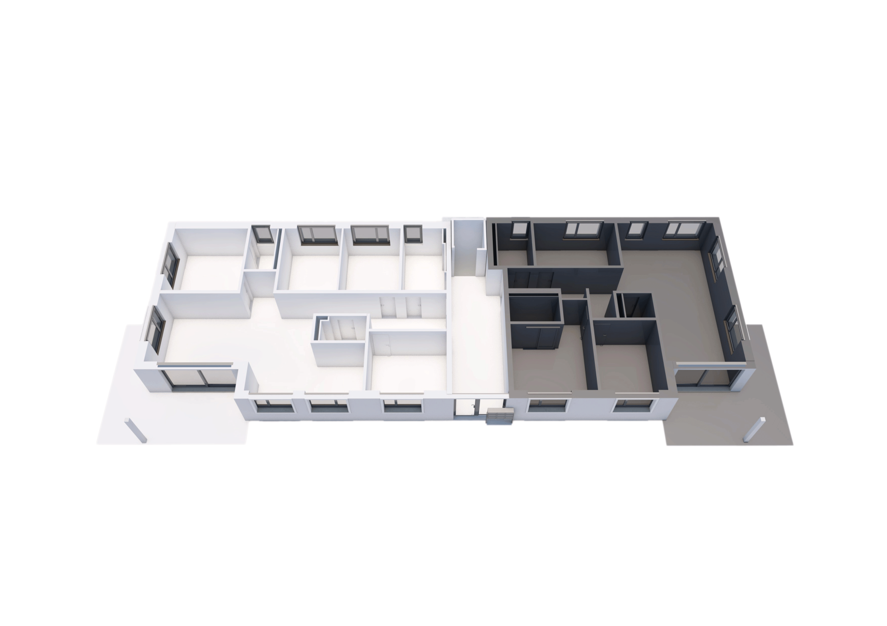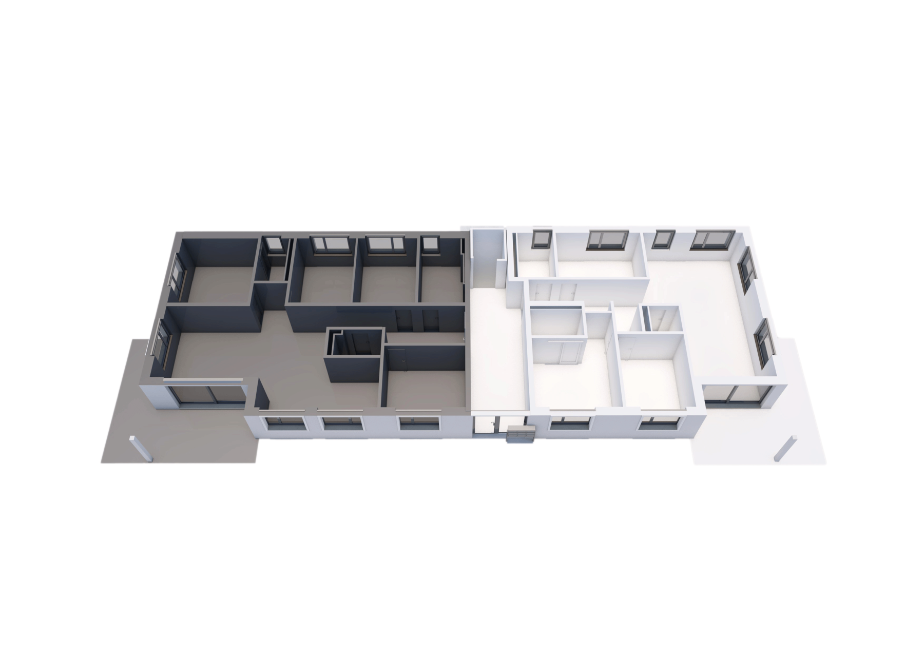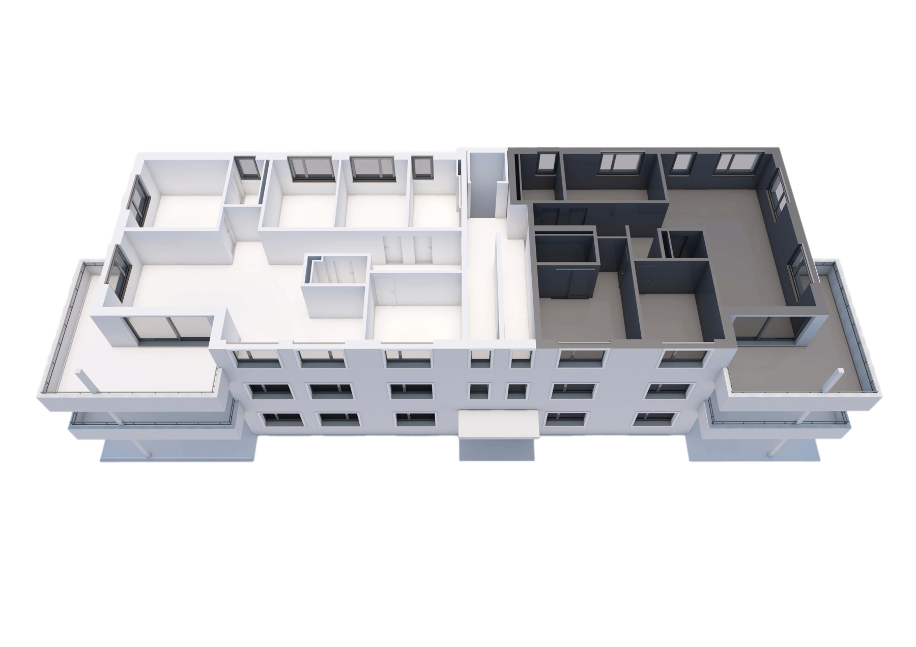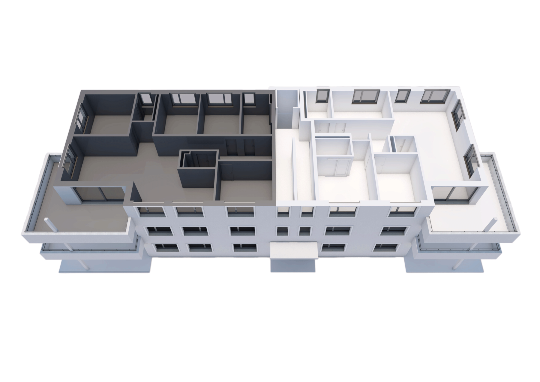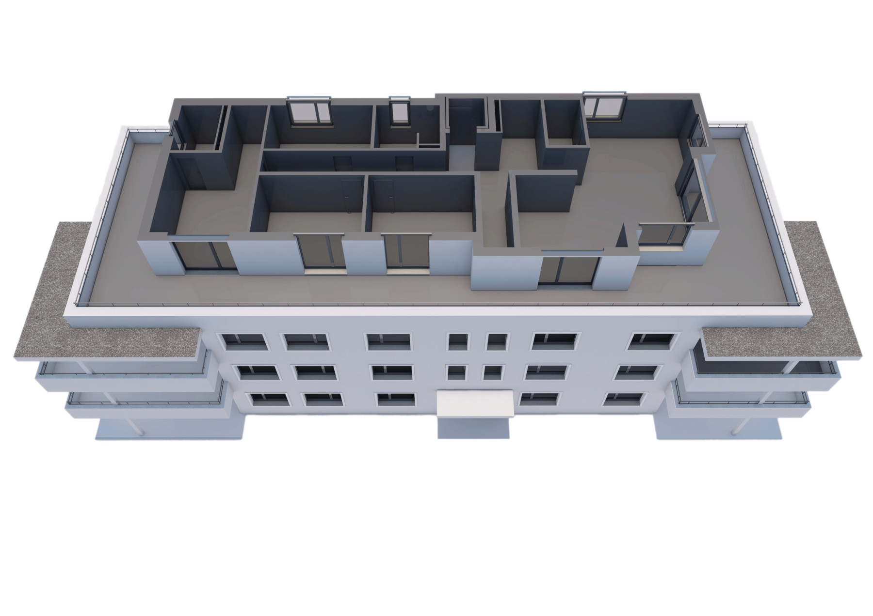 Der Flachdachaufbau wird als Warmdach konstruiert. Die Abdichtungen werden auf Bitumenbasis ausgeführt. Terrassenflächen werden mit Feinsteinzeugplatten belegt, nicht begehbare Flachdachteile mit Kiesbelag